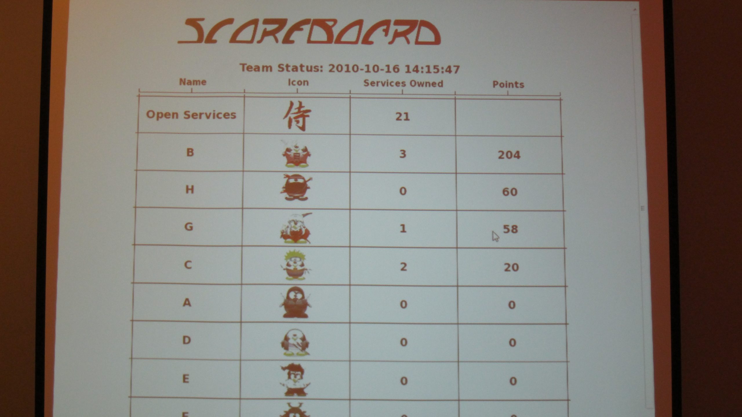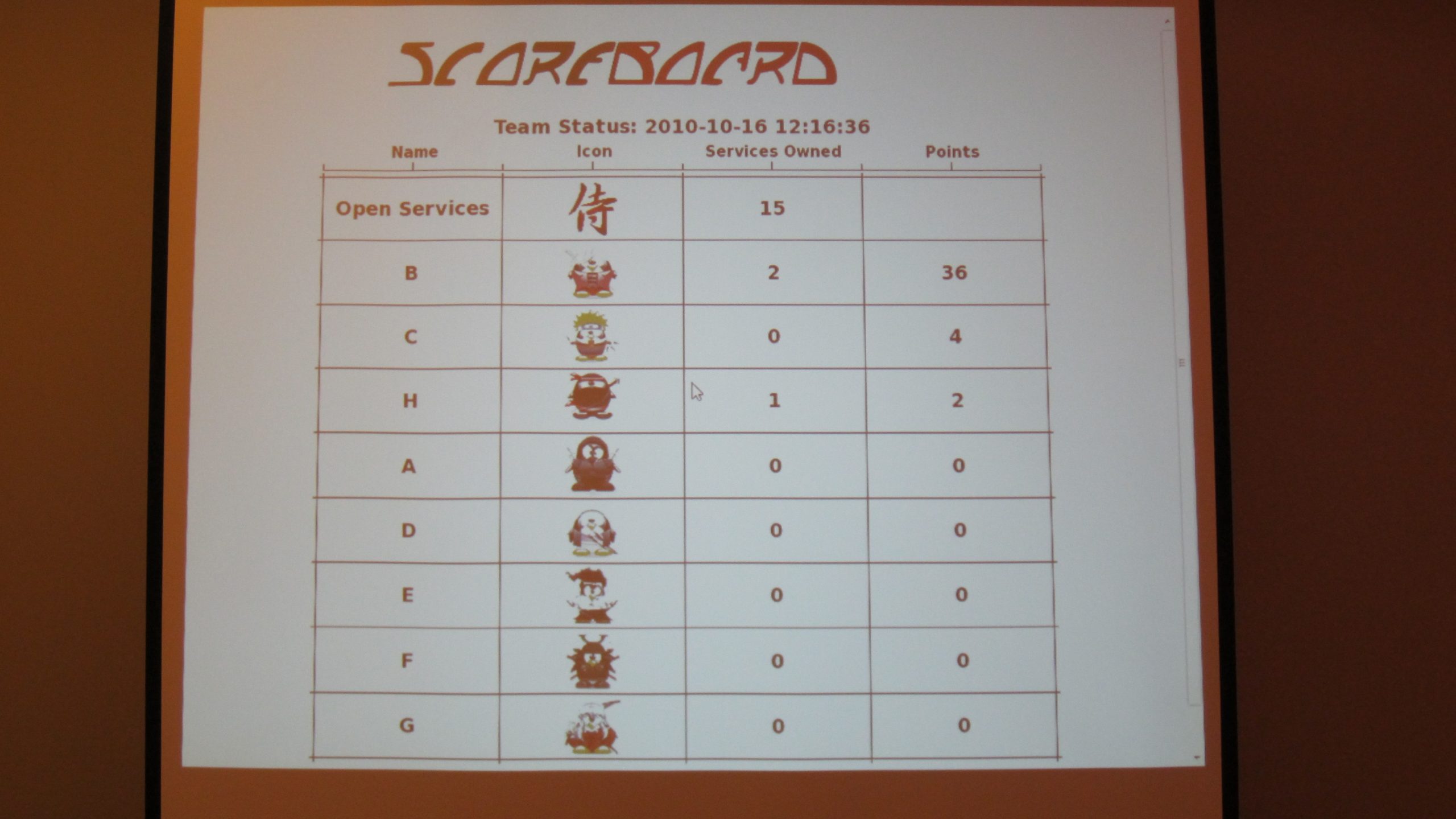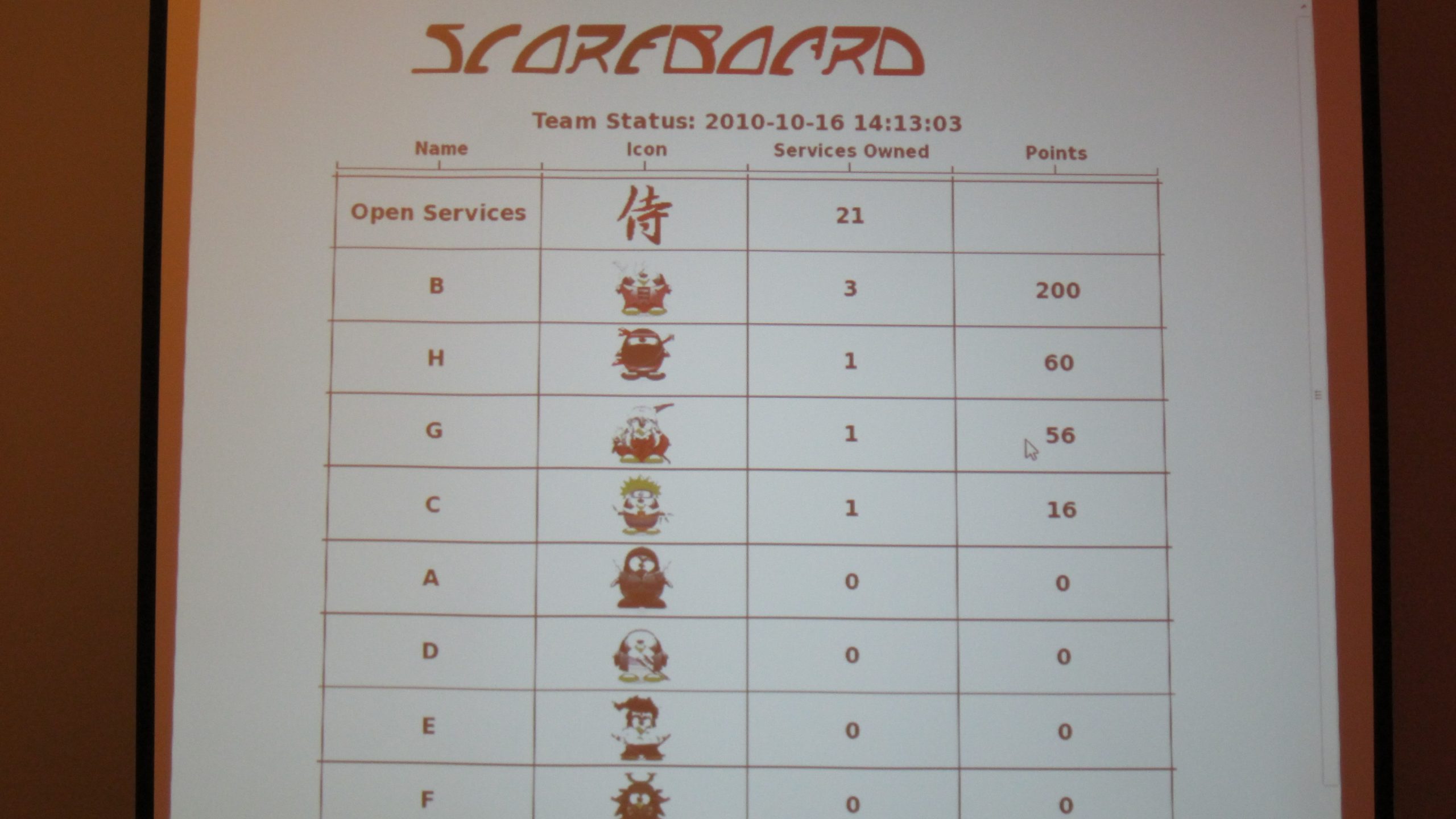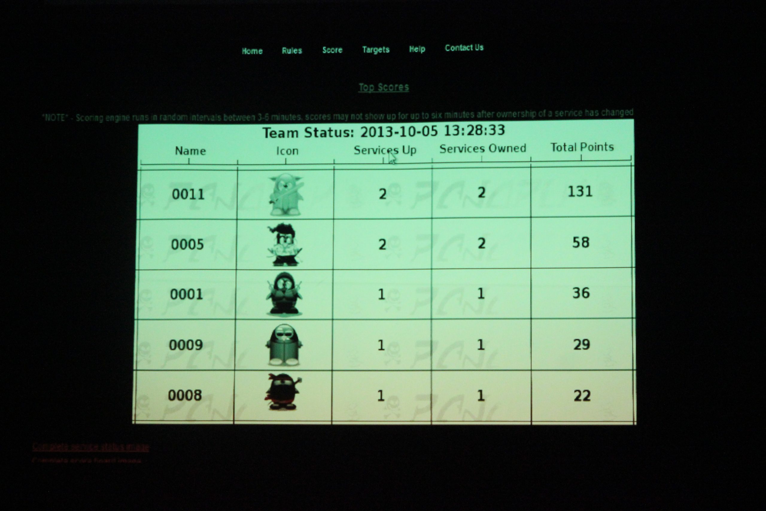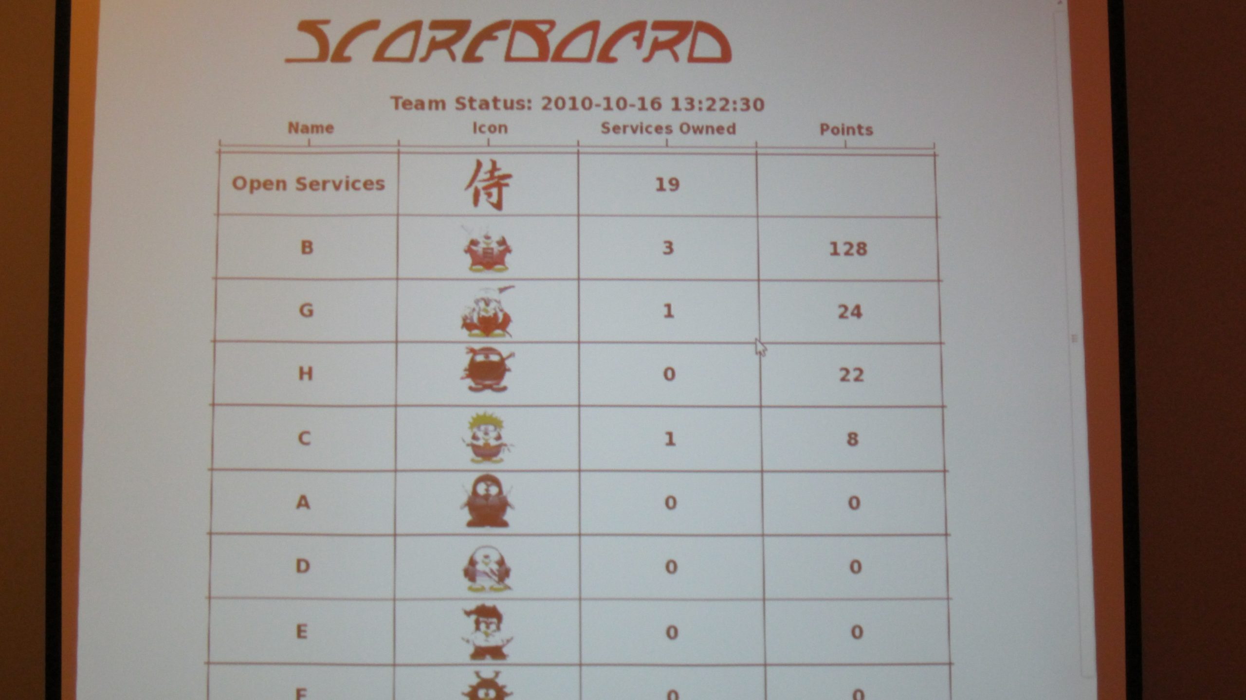 At random intervals, an automated scoring engine checks the status and functionality of all critical services. If a team has ownership of a functional critical service during a successful service check, that team is awarded points for owning and maintaining a critical service. Teams accumulate points for each critical service they control and continue to accumulate points as long as they own and maintain those critical services. Teams that fail to secure resources and services they have captured may have them taken away by rival teams.