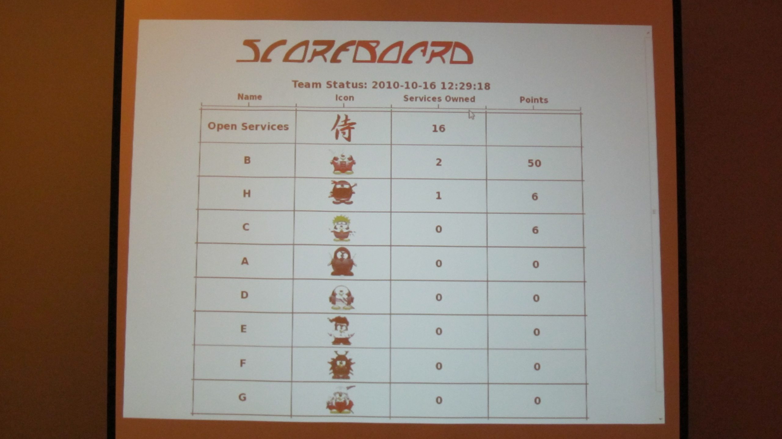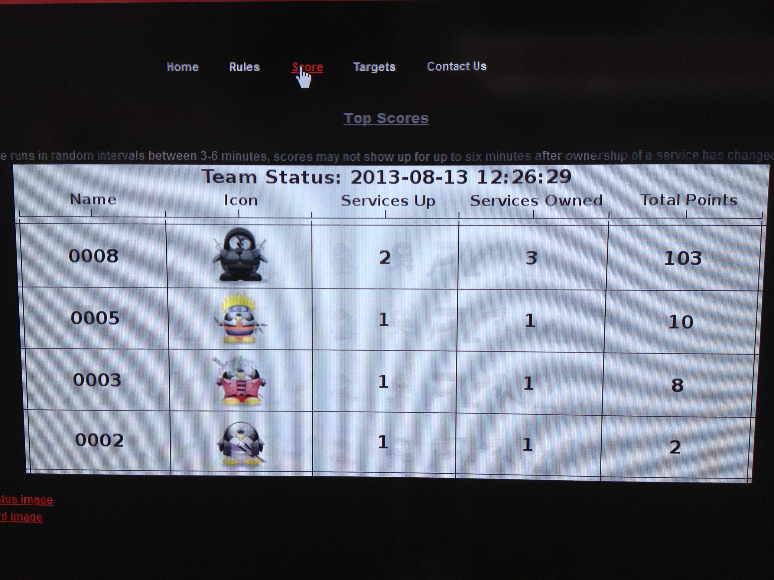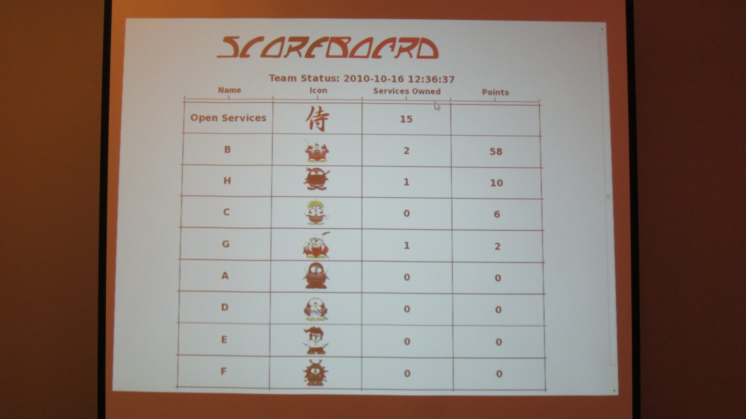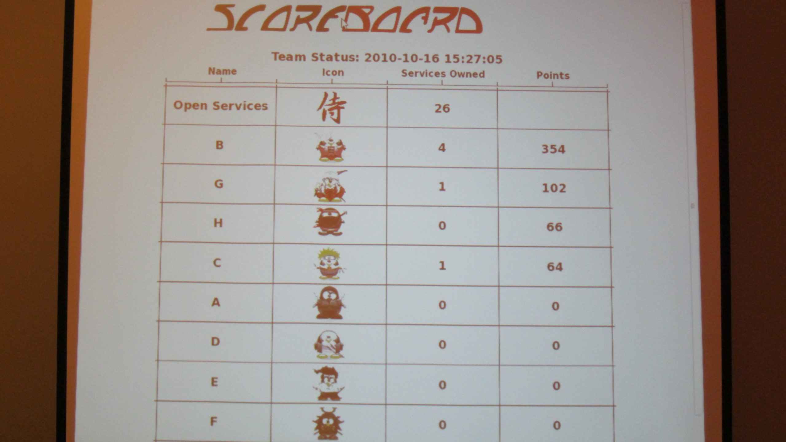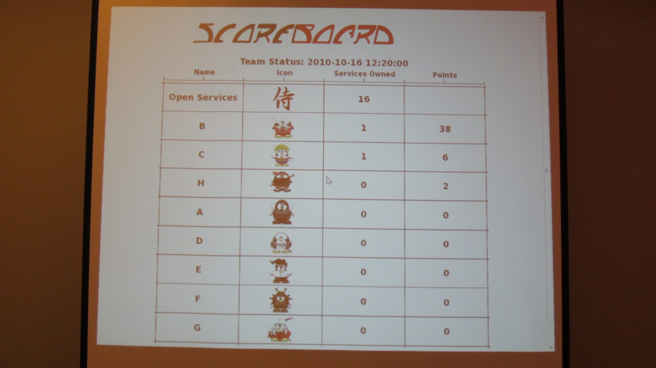 At random intervals, an automated scoring engine checks the status and functionality of all critical services. If a team has ownership of a functional critical service during a successful service check, that team is awarded points for owning and maintaining a critical service. Teams accumulate points for each critical service they control and continue to accumulate points as long as they own and maintain those critical services. Teams that fail to secure resources and services they have captured may have them taken away by rival teams.