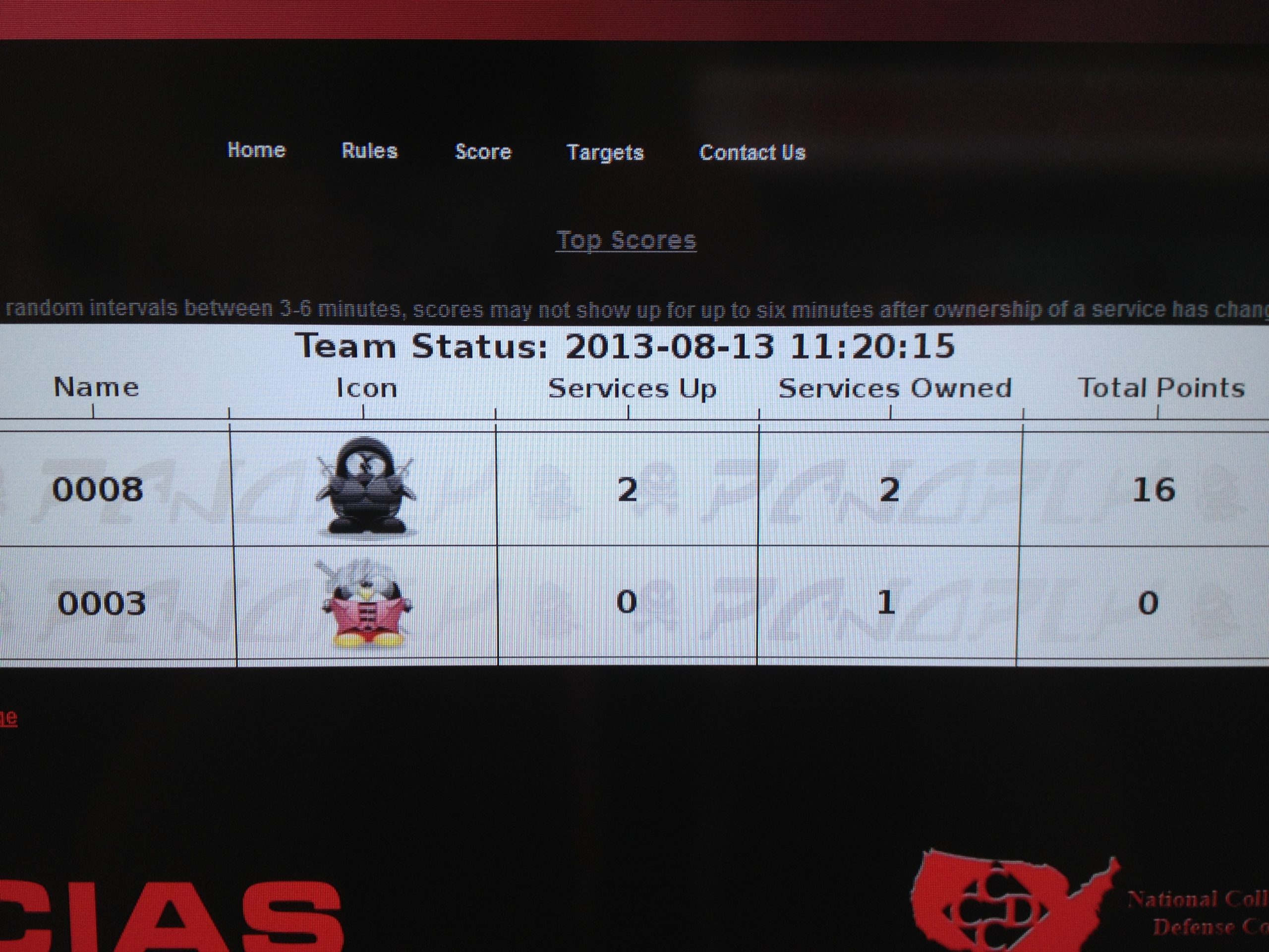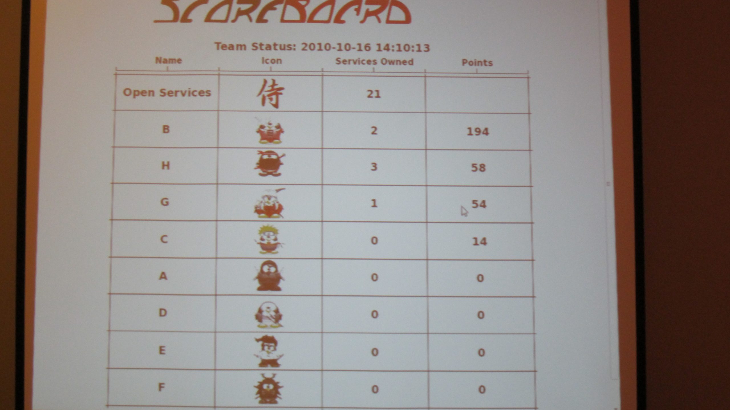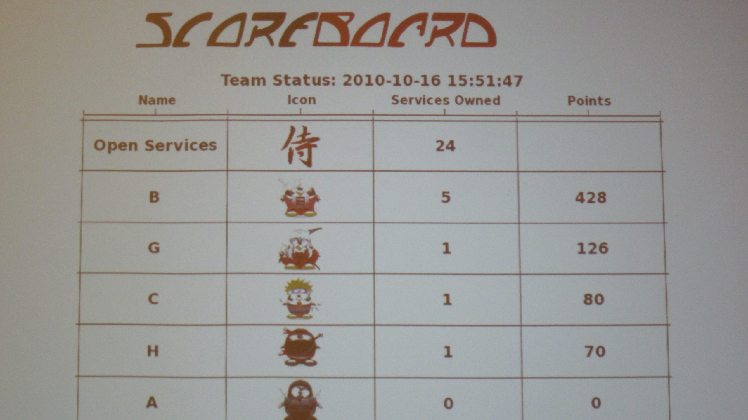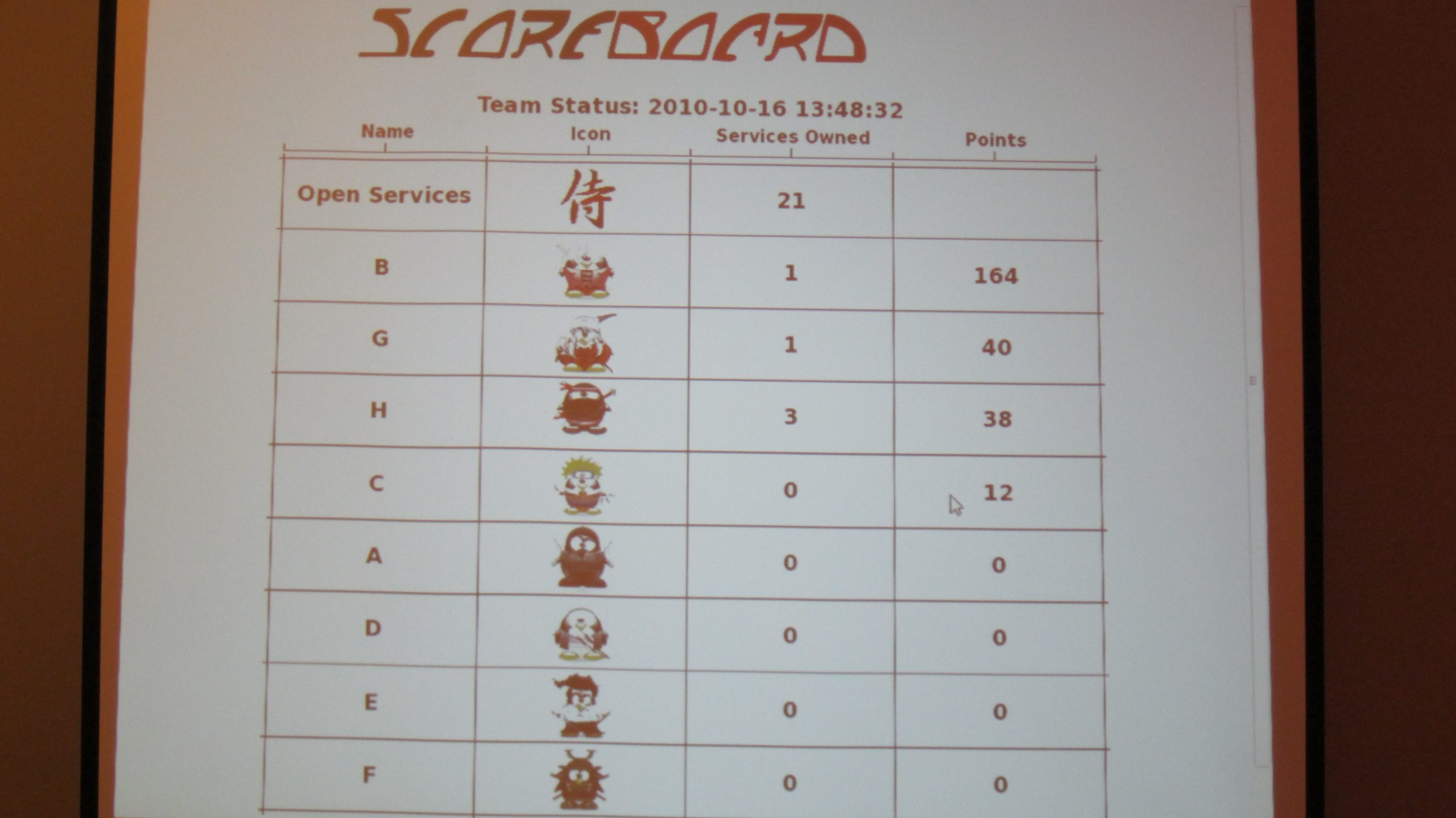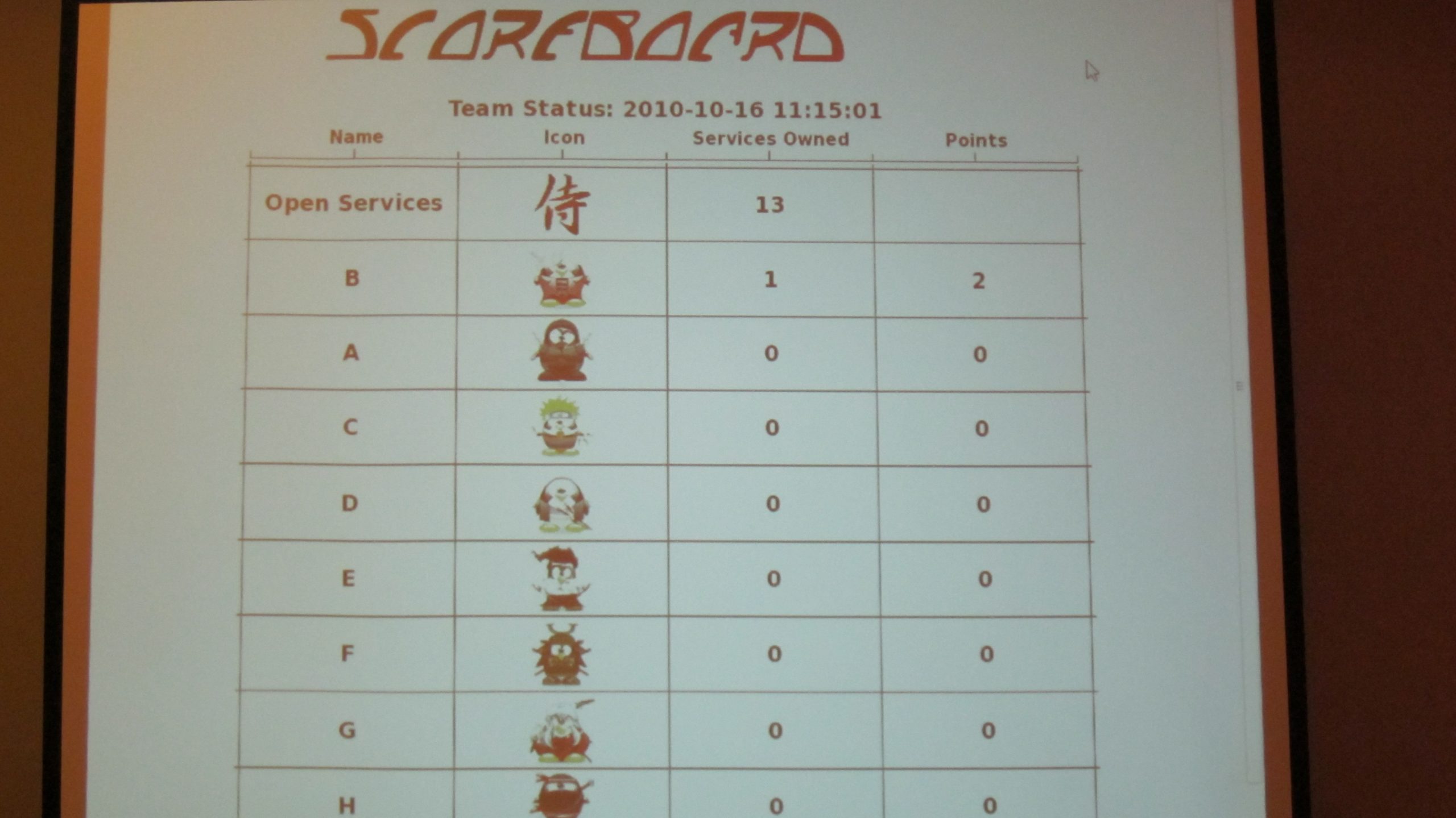 At random intervals, an automated scoring engine checks the status and functionality of all critical services. If a team has ownership of a functional critical service during a successful service check, that team is awarded points for owning and maintaining a critical service. Teams accumulate points for each critical service they control and continue to accumulate points as long as they own and maintain those critical services. Teams that fail to secure resources and services they have captured may have them taken away by rival teams.