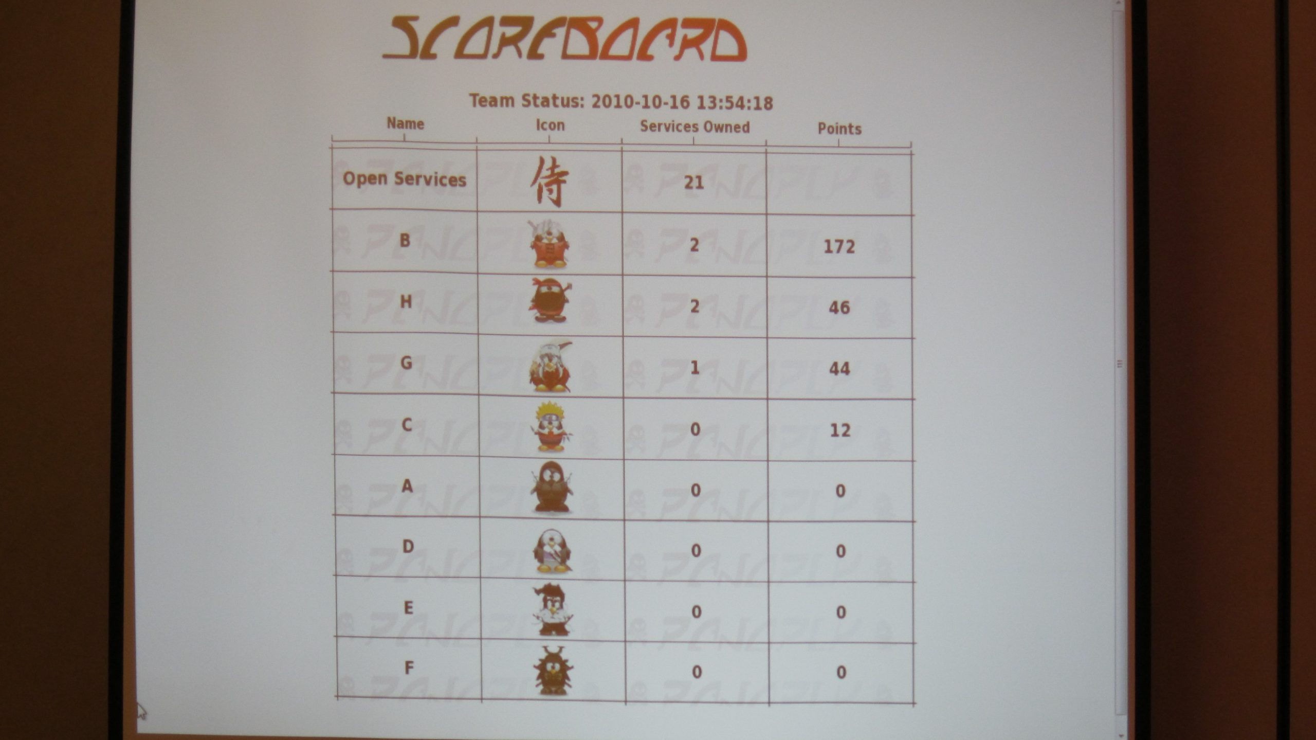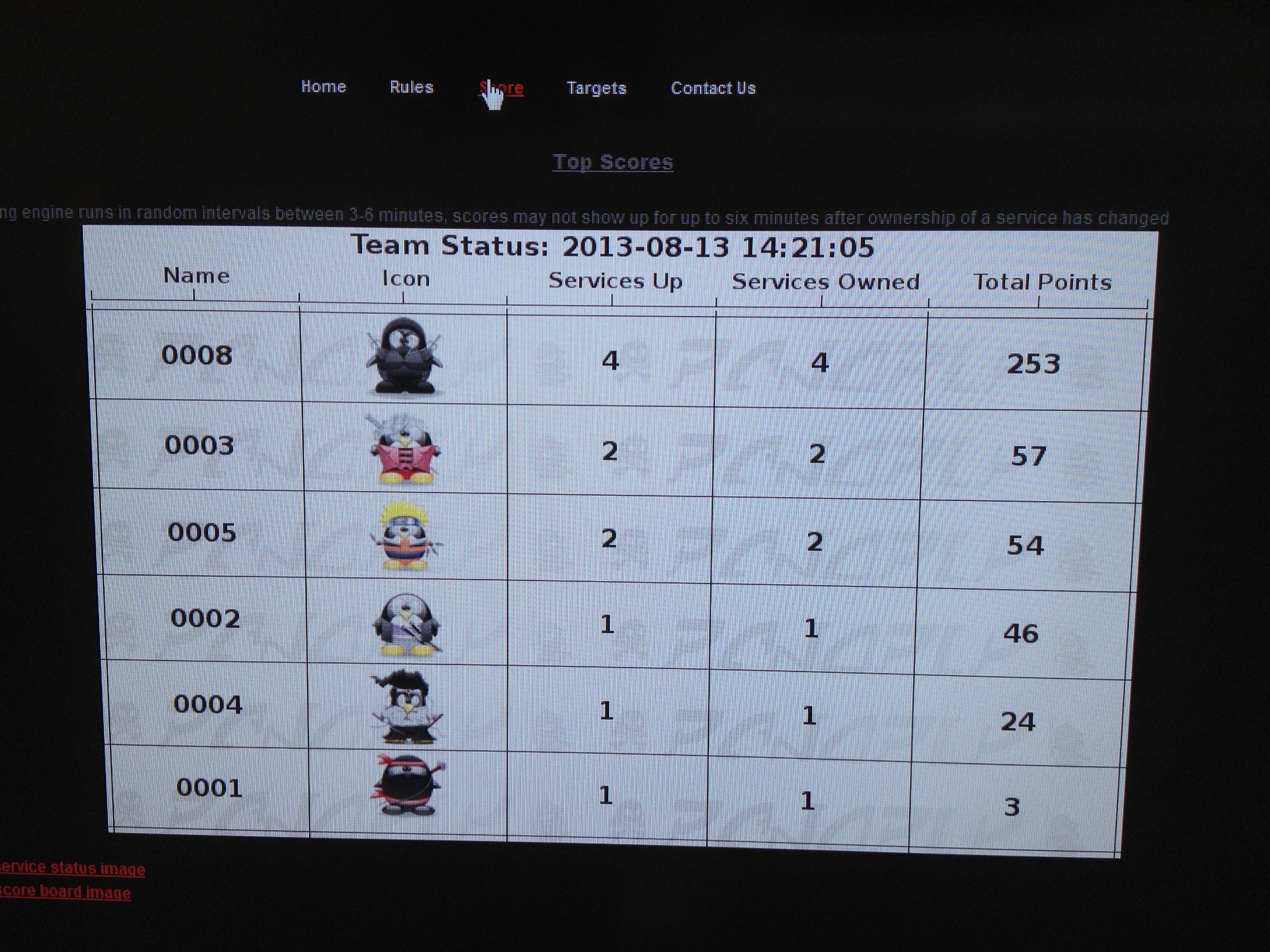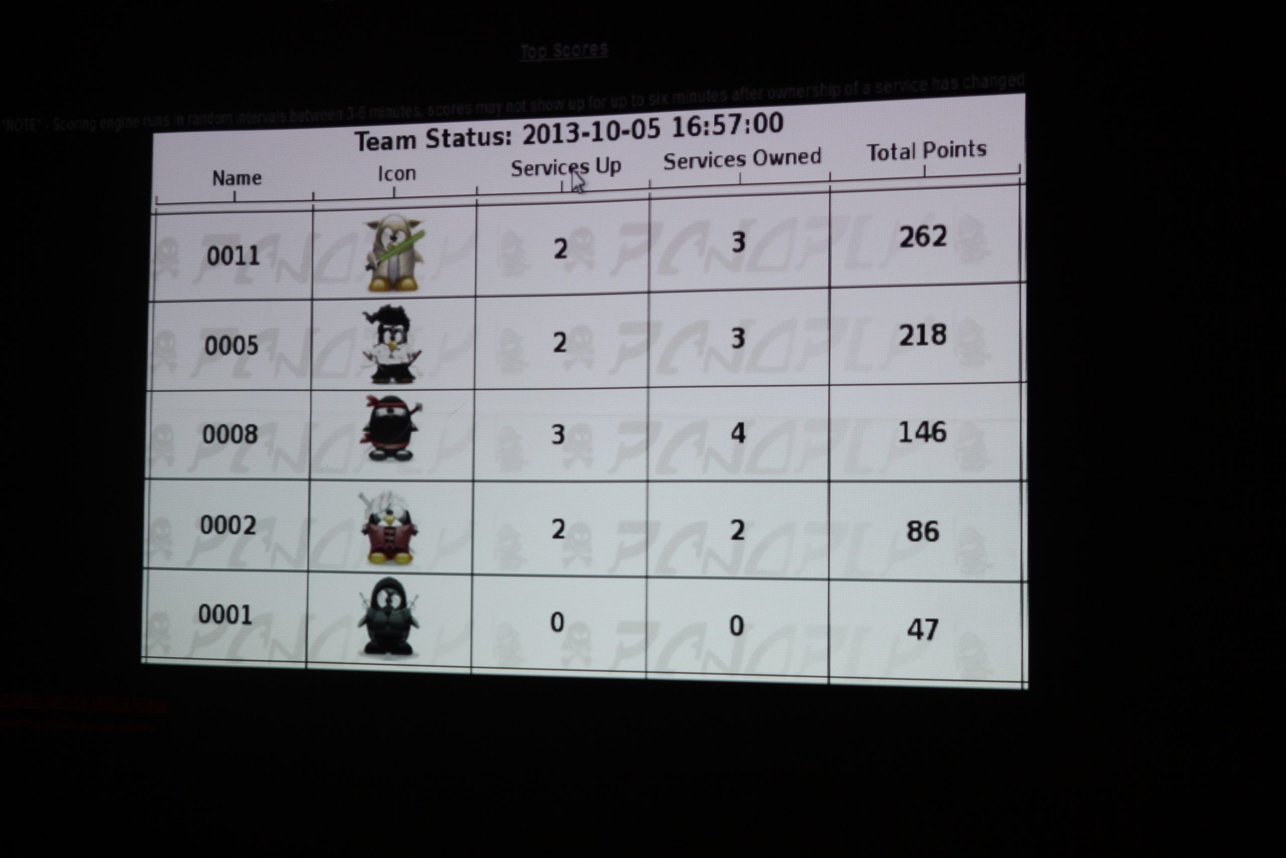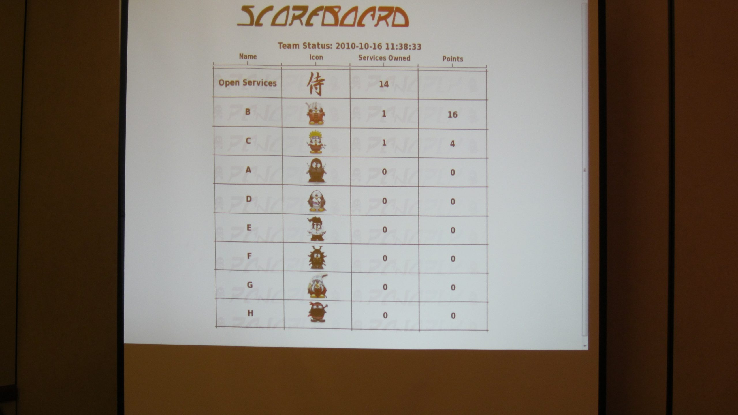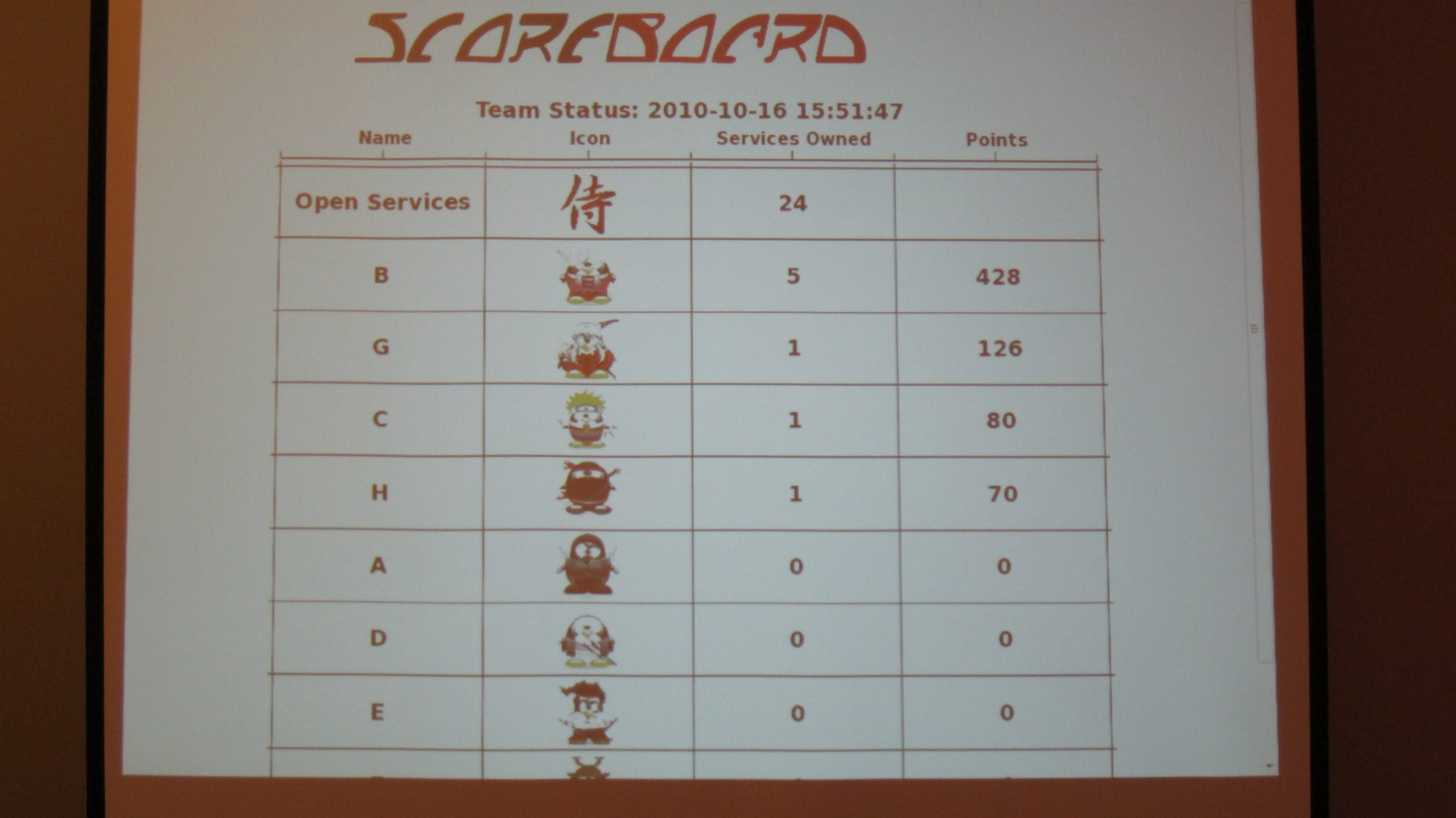 At random intervals, an automated scoring engine checks the status and functionality of all critical services. If a team has ownership of a functional critical service during a successful service check, that team is awarded points for owning and maintaining a critical service. Teams accumulate points for each critical service they control and continue to accumulate points as long as they own and maintain those critical services. Teams that fail to secure resources and services they have captured may have them taken away by rival teams.