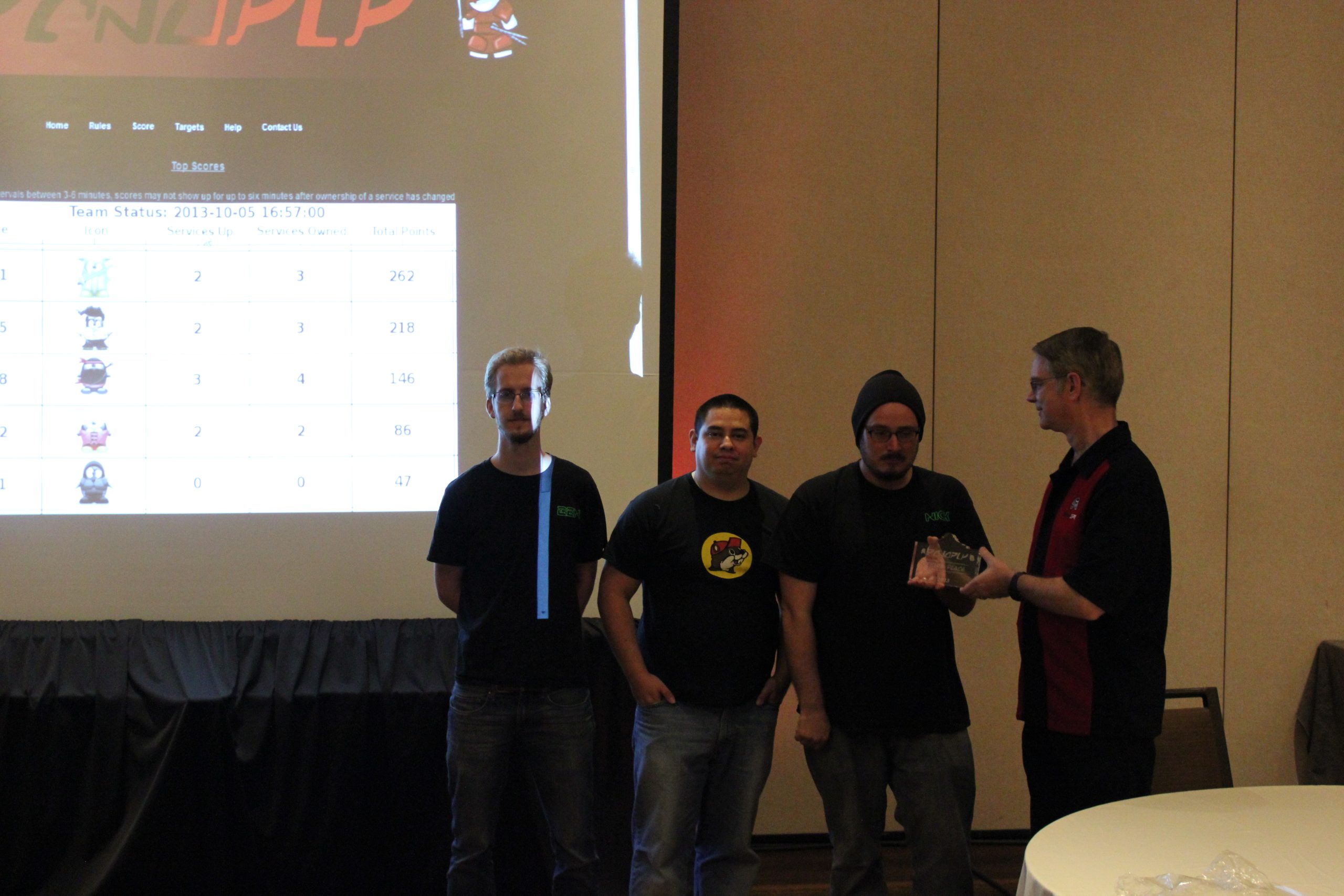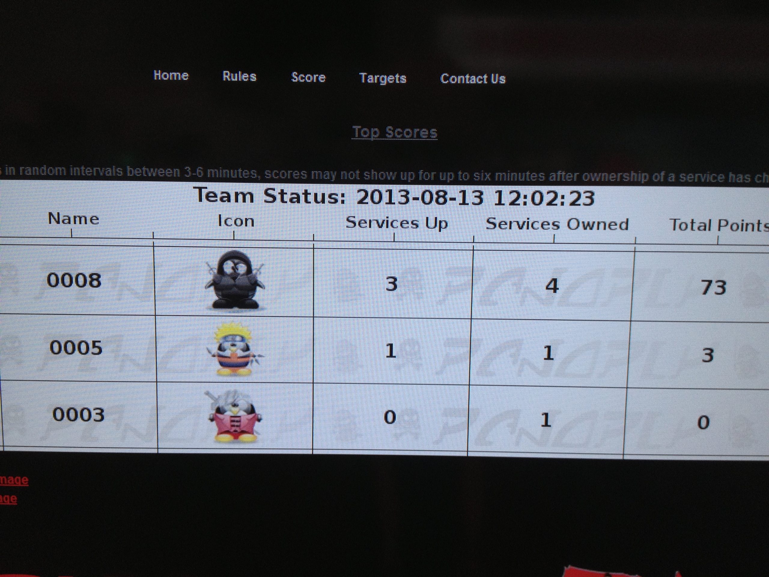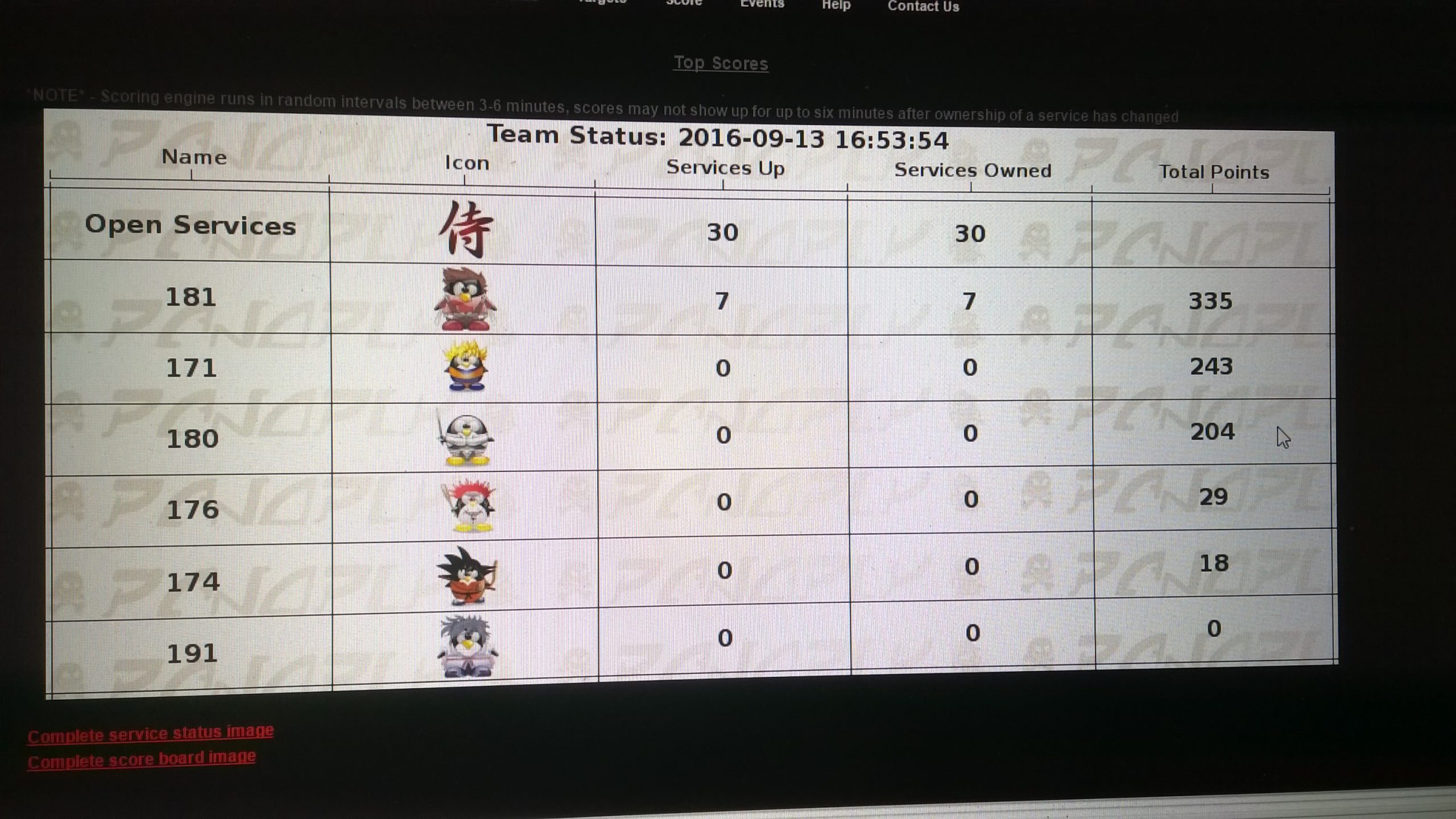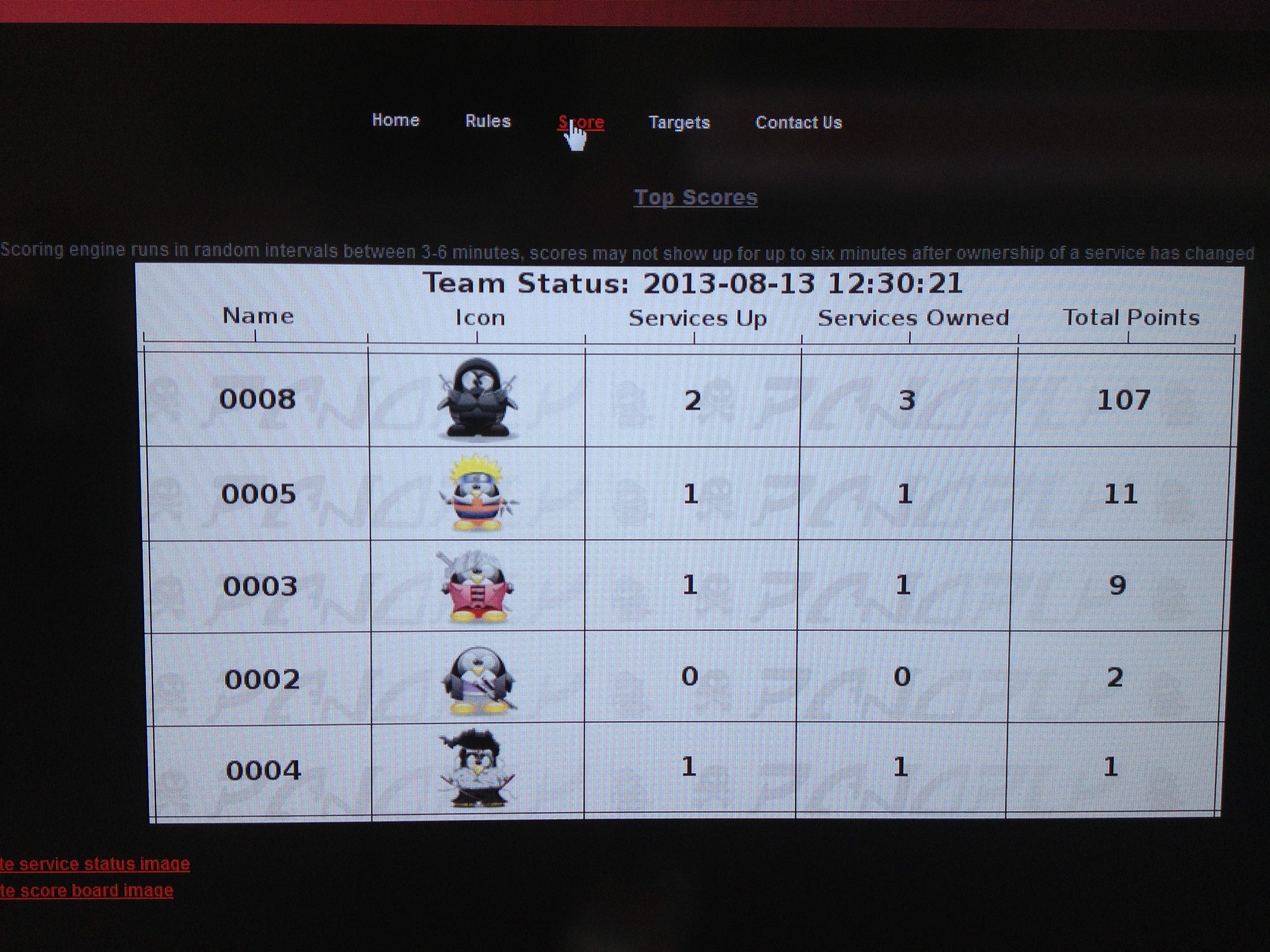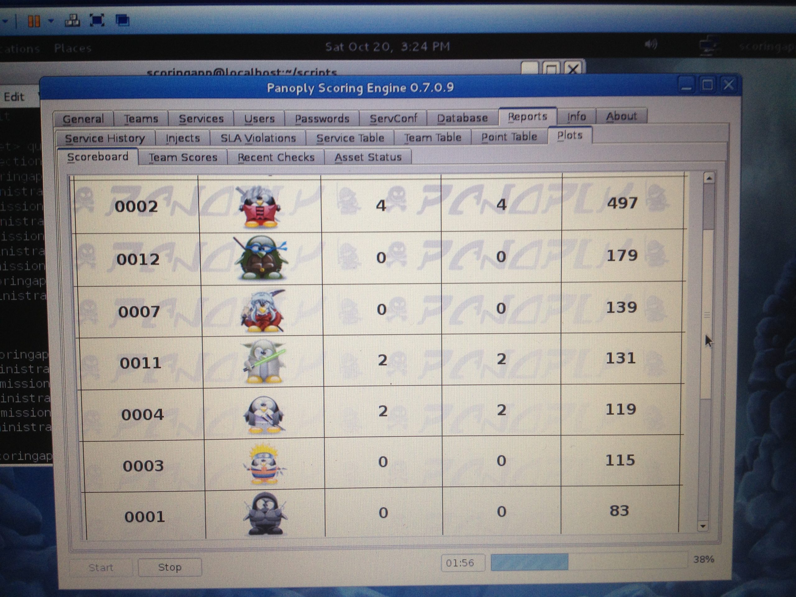 At random intervals, an automated scoring engine checks the status and functionality of all critical services. If a team has ownership of a functional critical service during a successful service check, that team is awarded points for owning and maintaining a critical service. Teams accumulate points for each critical service they control and continue to accumulate points as long as they own and maintain those critical services. Teams that fail to secure resources and services they have captured may have them taken away by rival teams.