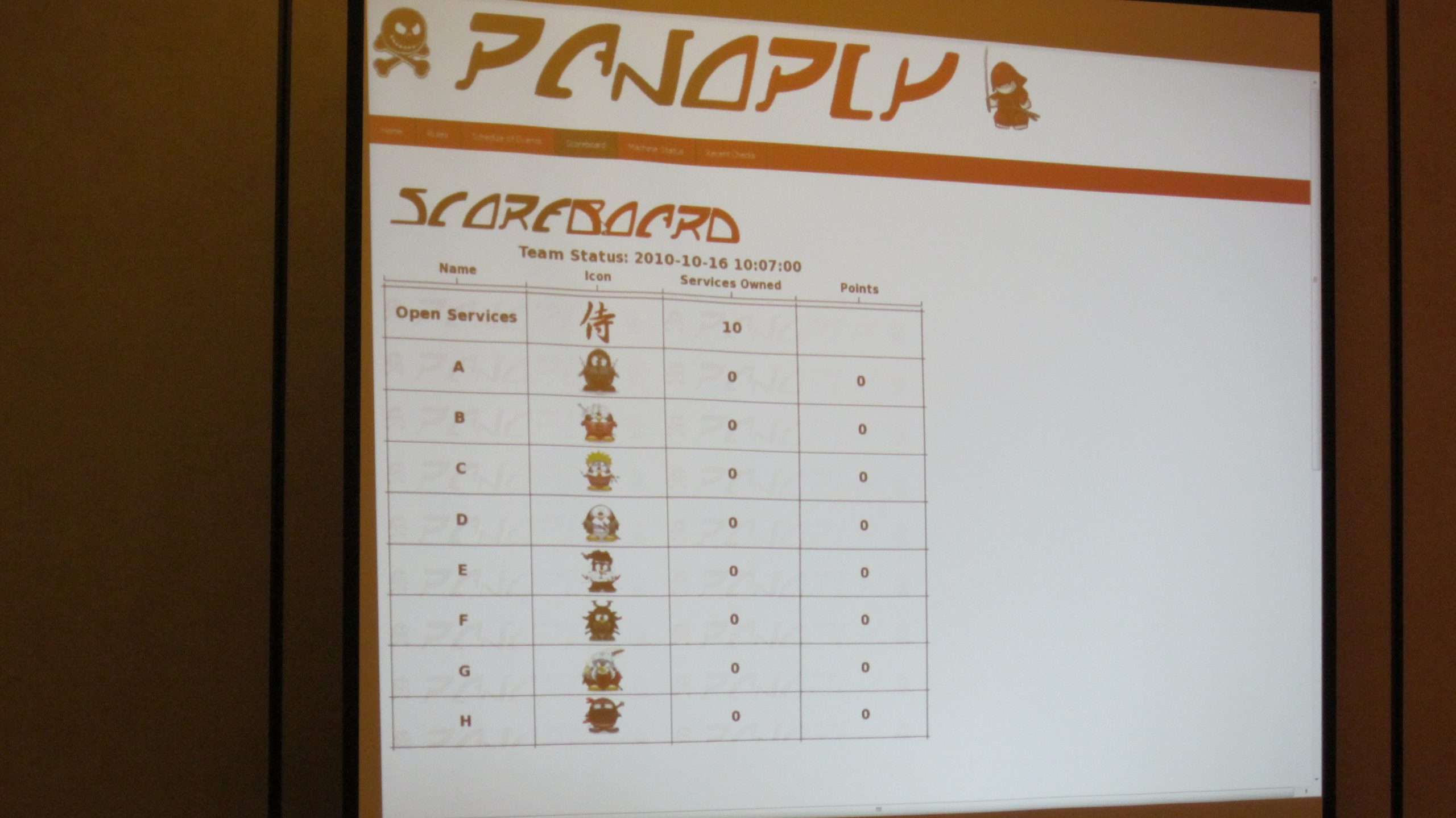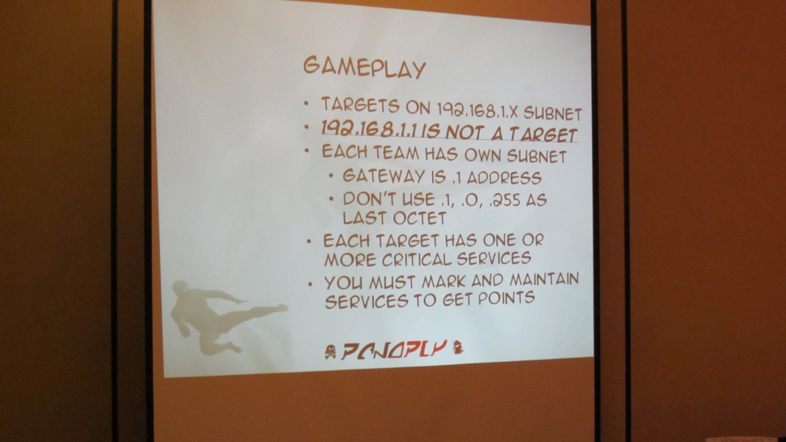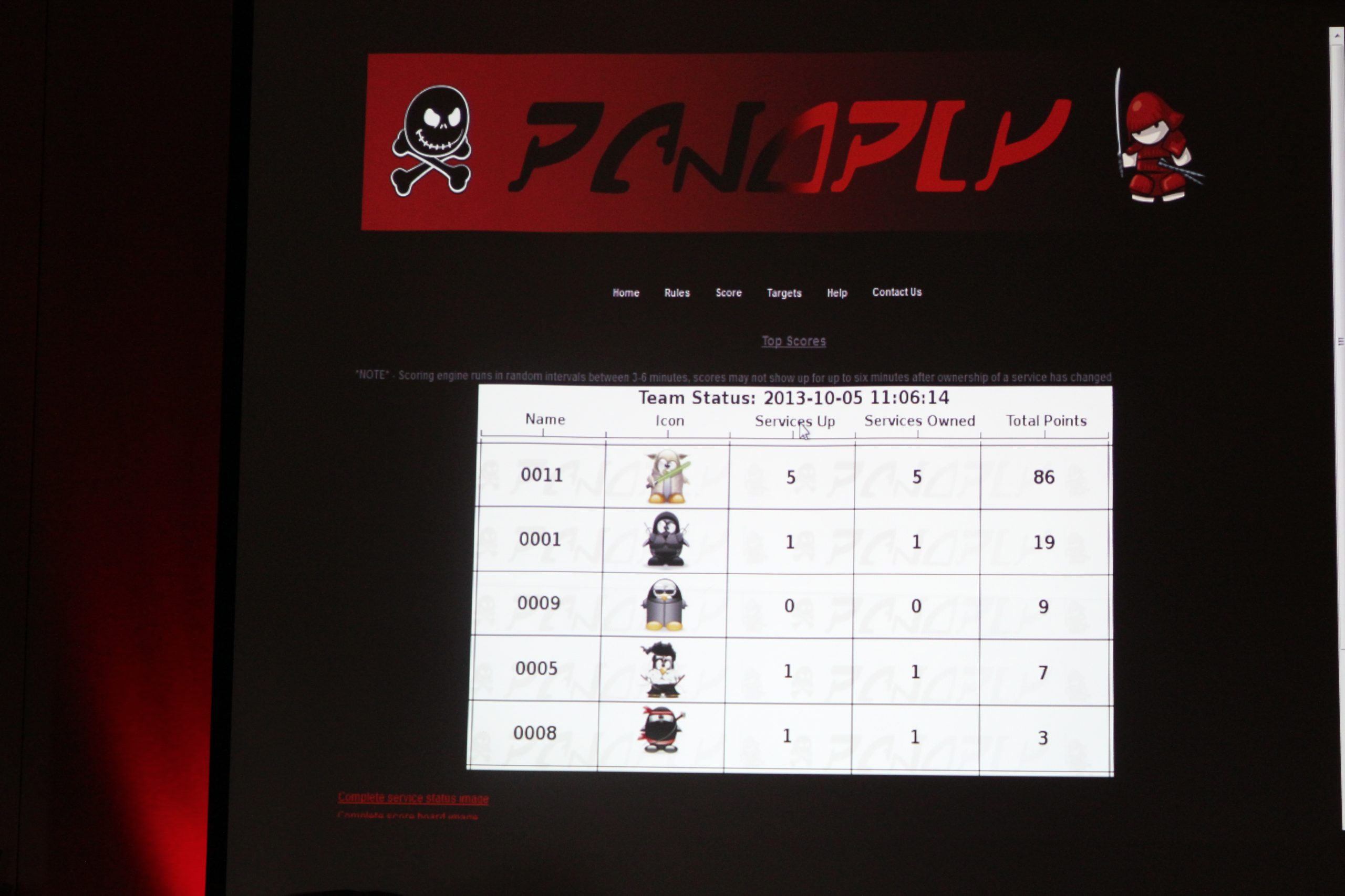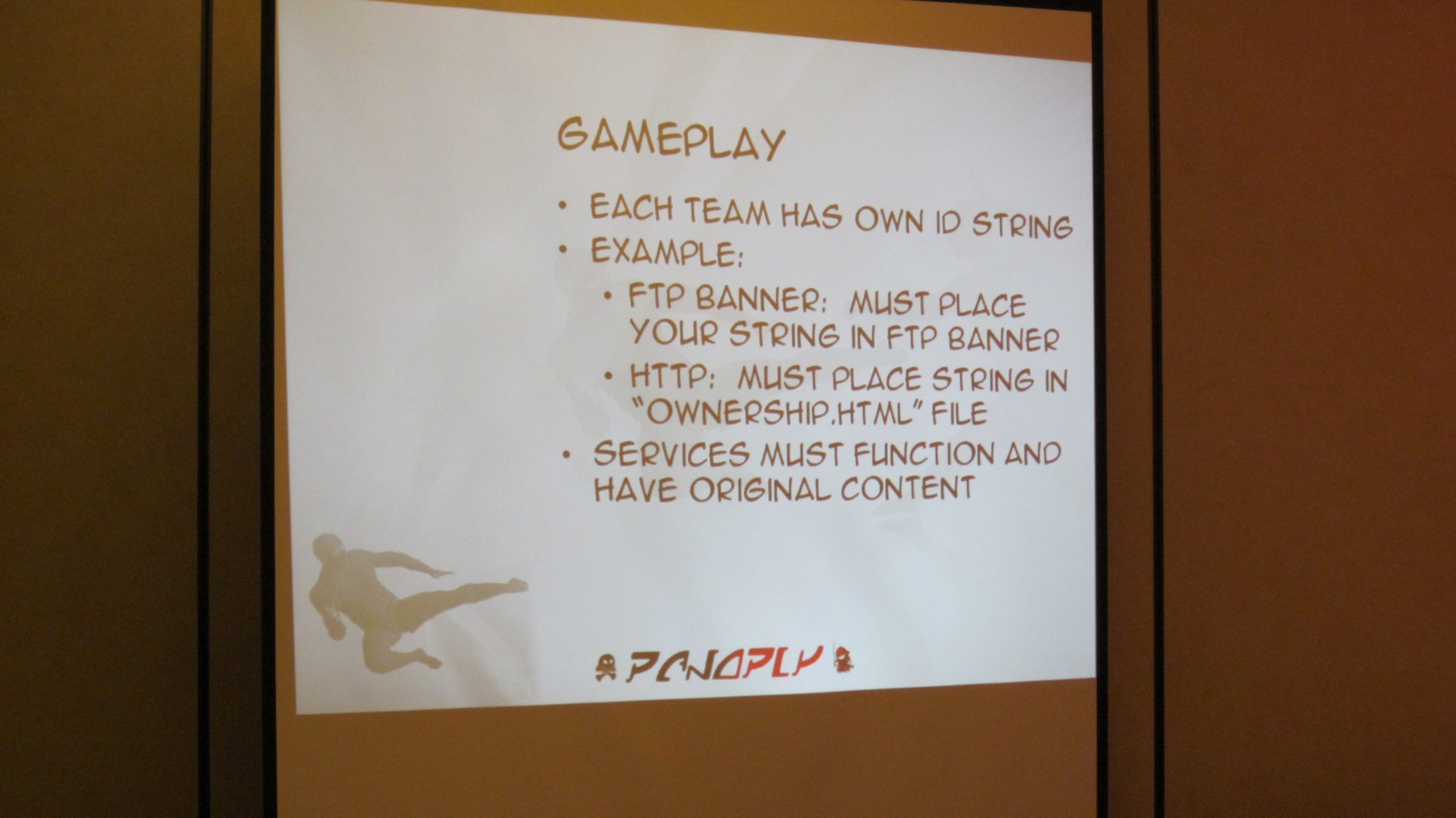 Panoply is a timed competition event. At the beginning of the competition, common resources are available for teams to scan, assess, and penetrate. To claim ownership of a service, teams must plant their flag, an assigned hexadecimal string, inside the banner of the service. An automated scanner detects ownership changes and awards ownership of the service to the team whose flag appears in the service banner.