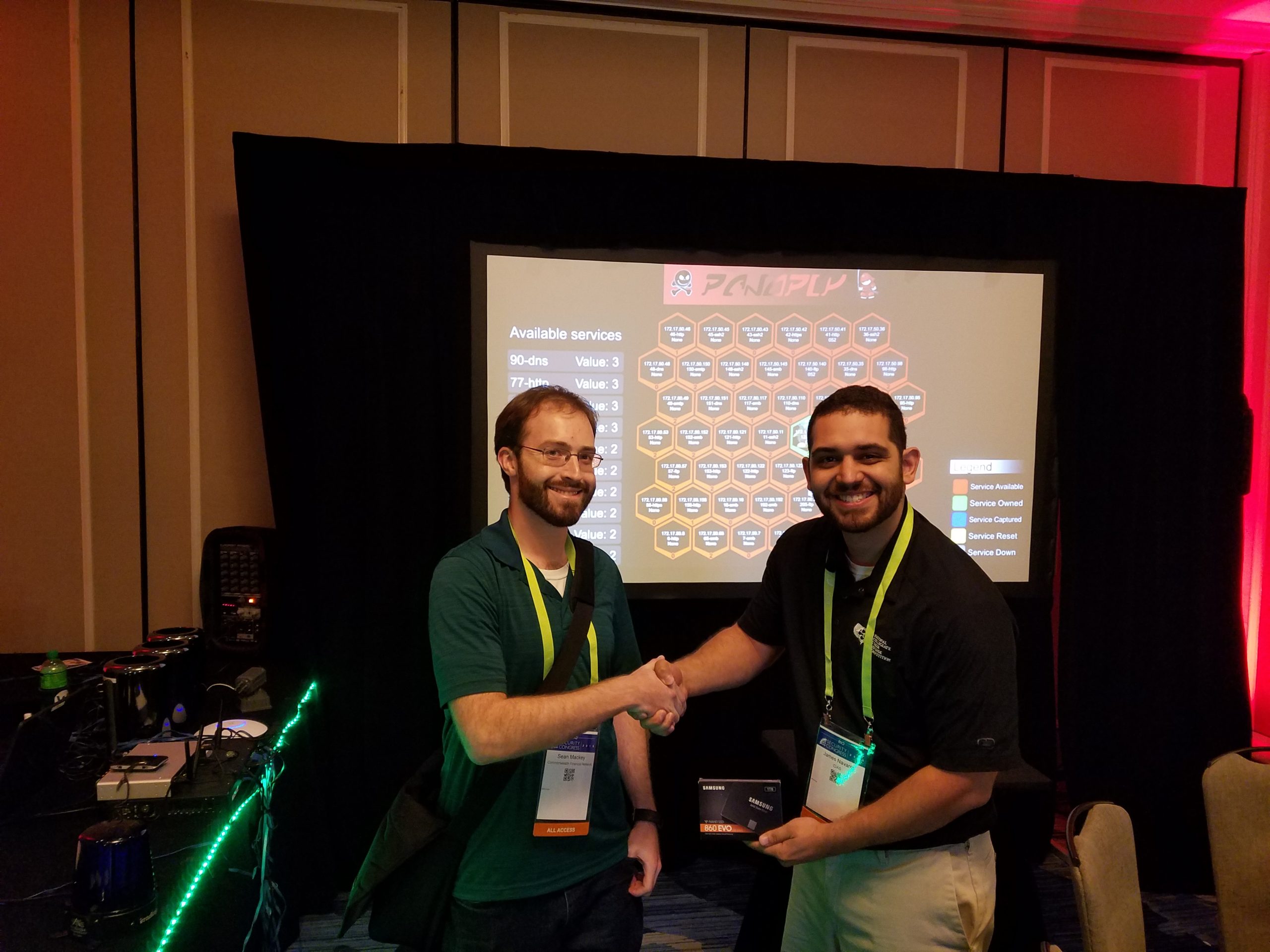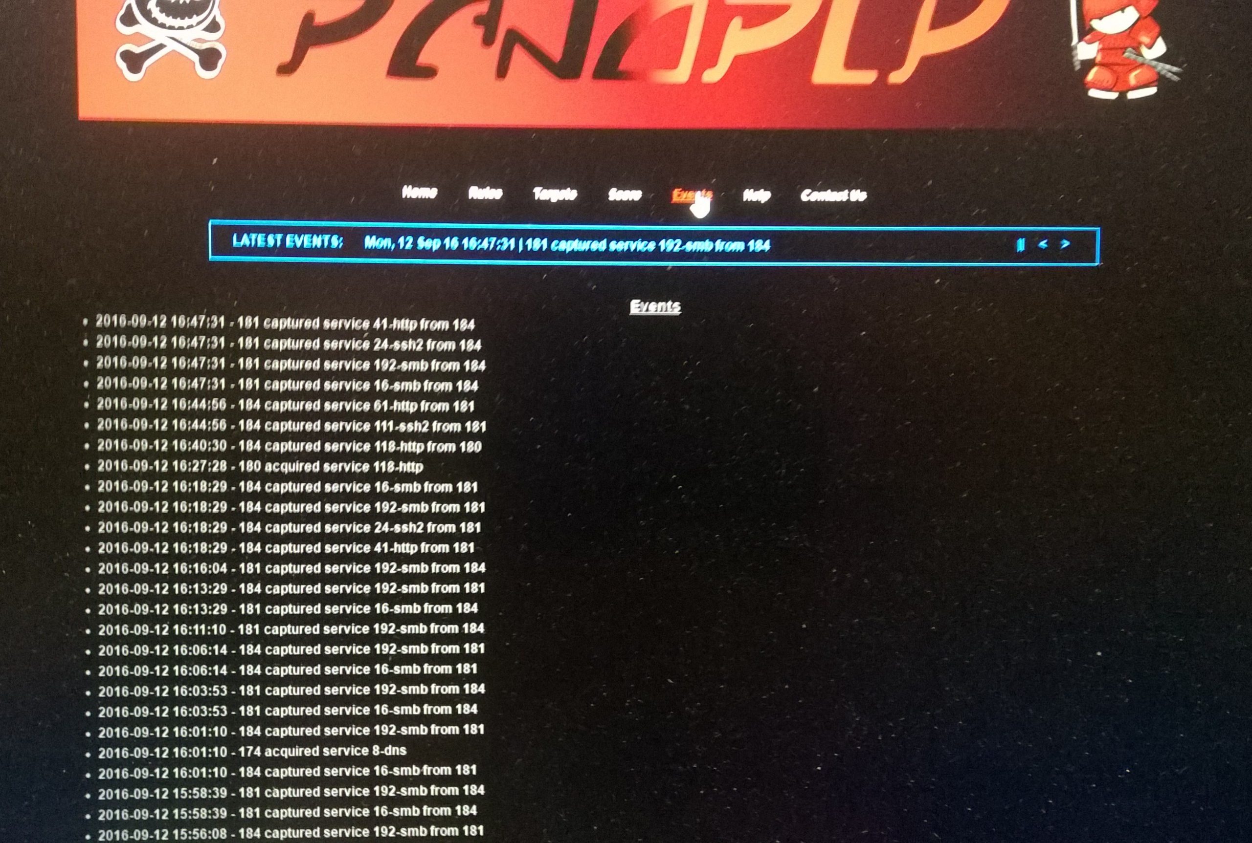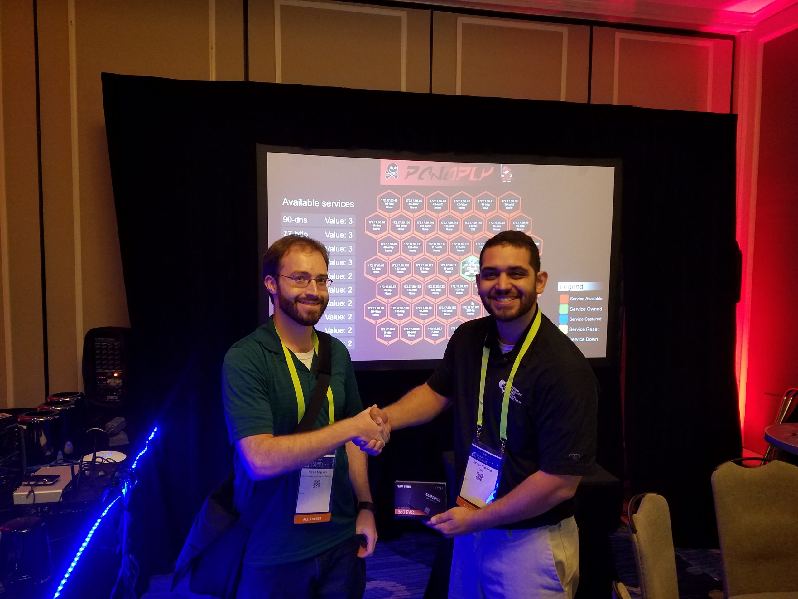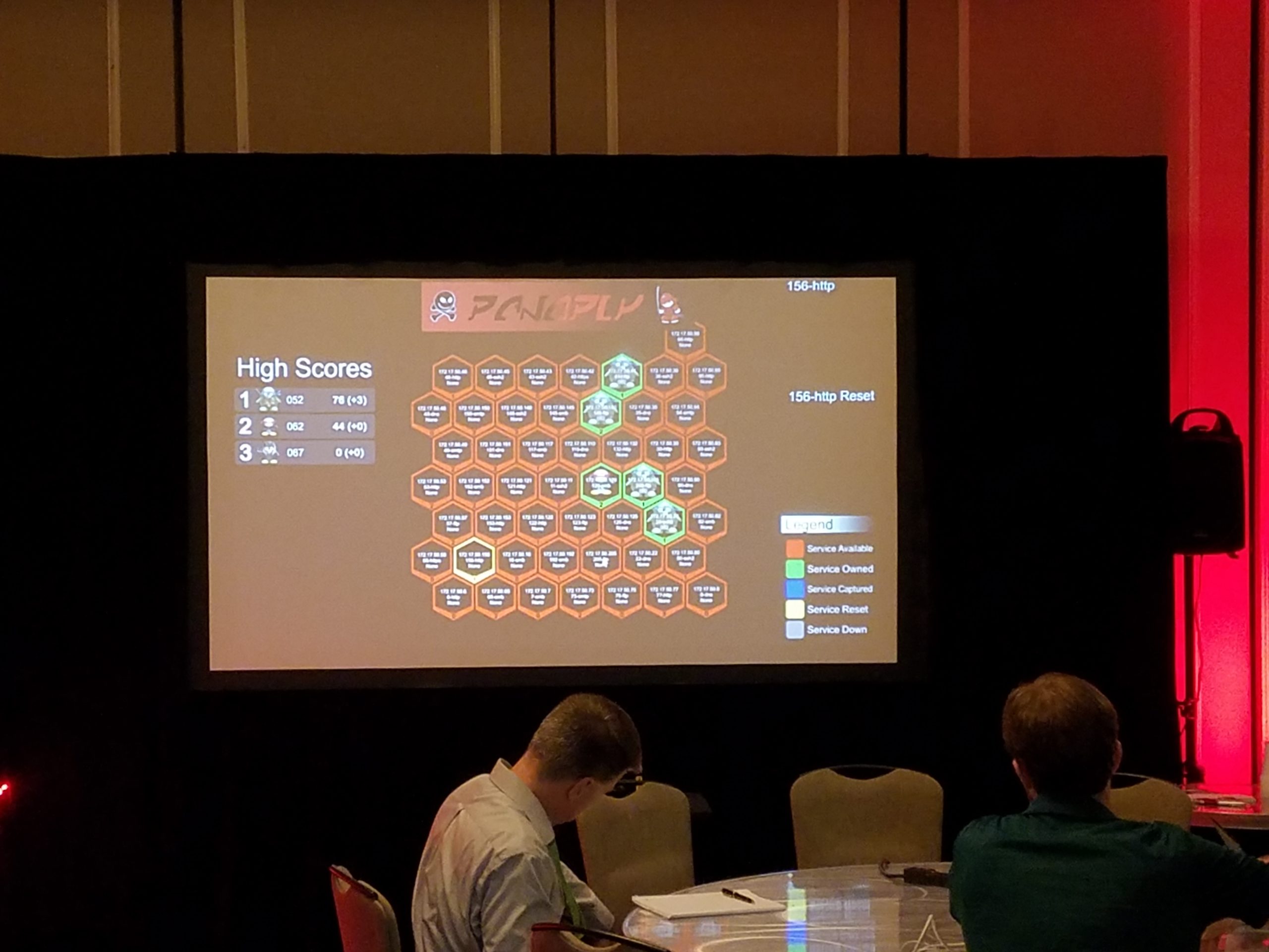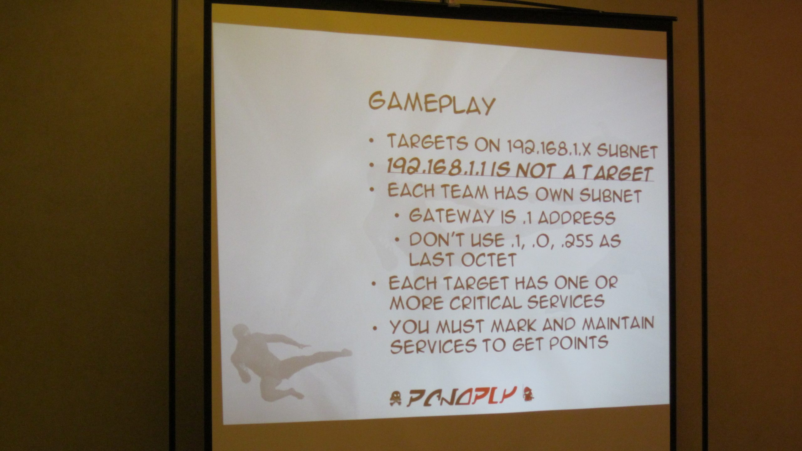 Panoply is a timed competition event. At the beginning of the competition, common resources are available for teams to scan, assess, and penetrate. To claim ownership of a service, teams must plant their flag, an assigned hexadecimal string, inside the banner of the service. An automated scanner detects ownership changes and awards ownership of the service to the team whose flag appears in the service banner.