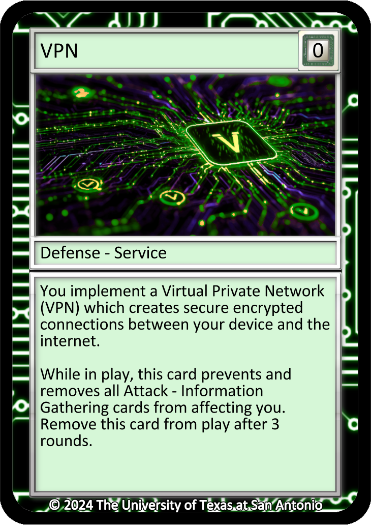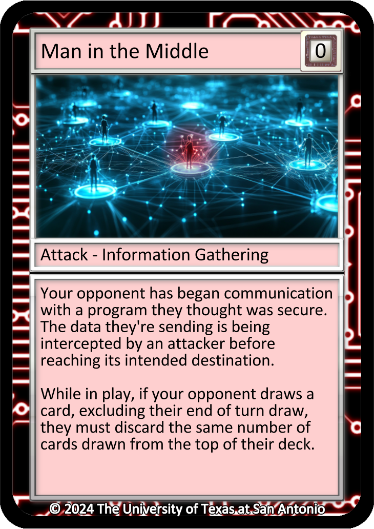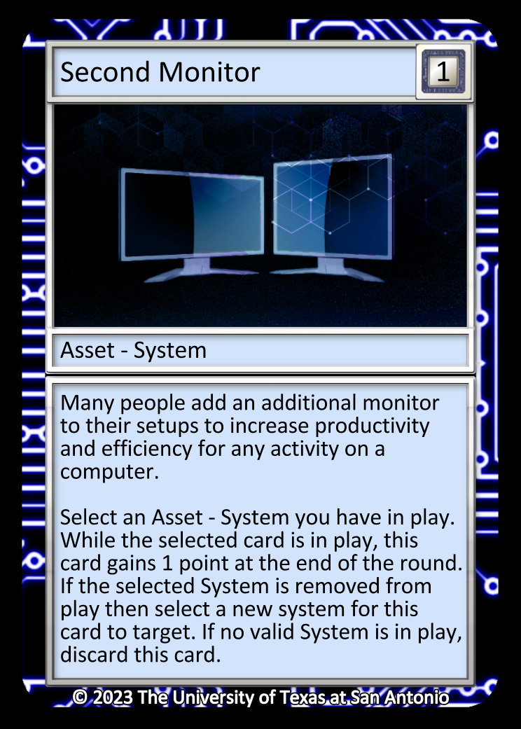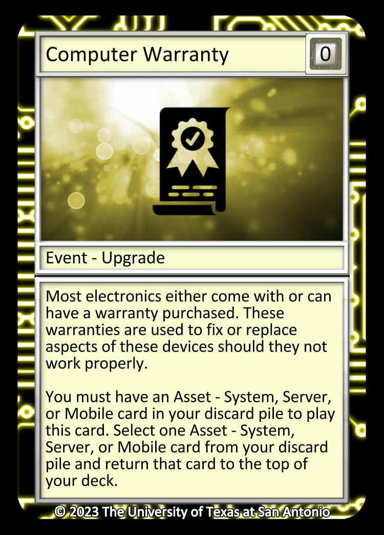 - Rarity Appropriateness: While card submissions are expected to be unique from existing cards (see full list of cards here), some cards may be duplicated for ultimate effects (e.g., an ISP Connection card allows for two Desktop Assets to attach to it). Feel free to include comments with your submission about the card’s rarity appropriateness.