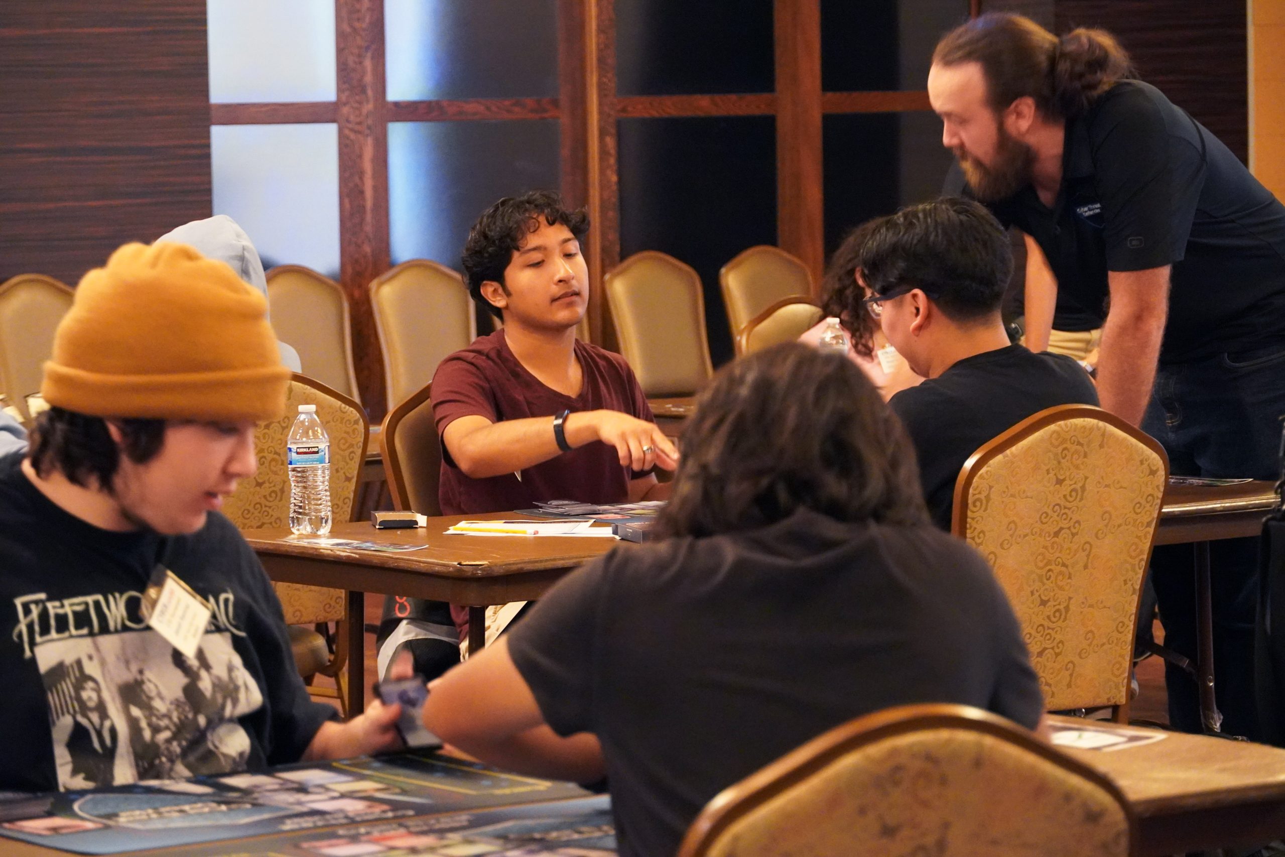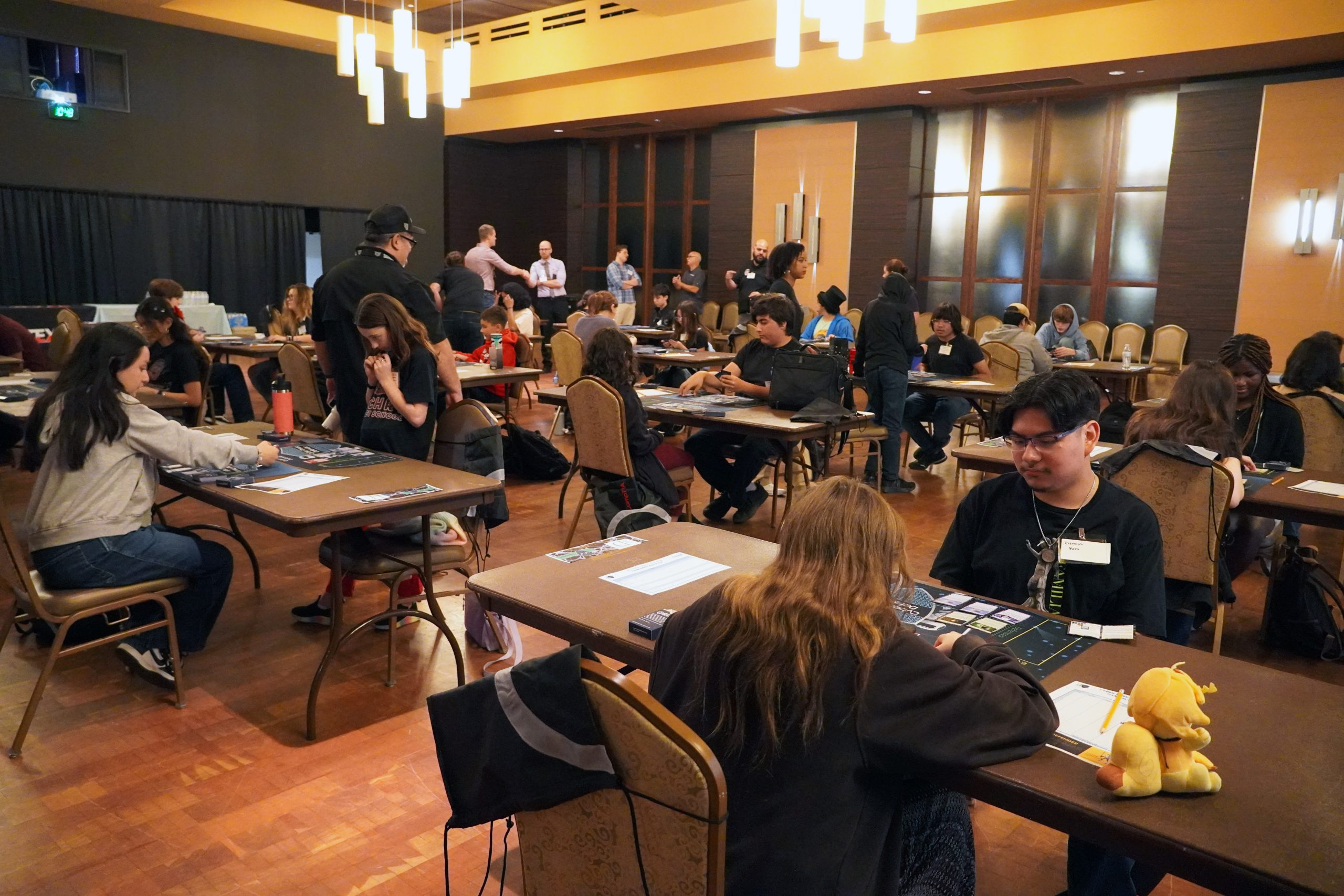 The main consideration for a space to host your tournament is to have enough square or rectangular tables to fit the maximum number of players you would like to support. Ideally, you should fit two players per “table”, with opponents facing across from each other. A table should be no less than 28” in depth and 70” wide. This will account for game mats and score sheets. (Four players can also use this same space but with less “elbow-room”!).
