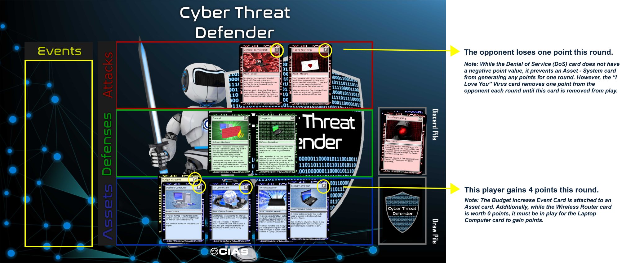 The goal of Cyber Threat Defender (CTD) is to securely increase the size of your network. The more robust your network (or number of asset cards), the more points a player earns each turn. The first player to reach 30 points wins the game.