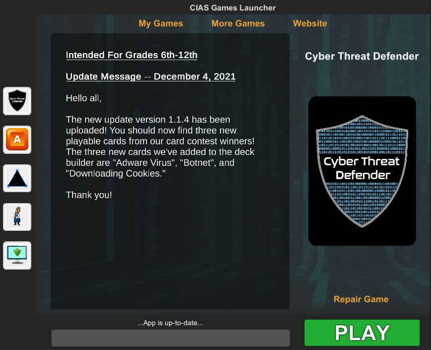 The second prototype game, Pyramid of Knowledge, is designed as a testing tool for teachers. It provides educators with the ability to build their own quizzes for use in the game interface. And rounding out these games is Cyber Threat Defender: Digital, targeting players 11 years old and up! All of these cybersecurity games can be found within the CIAS Launcher.