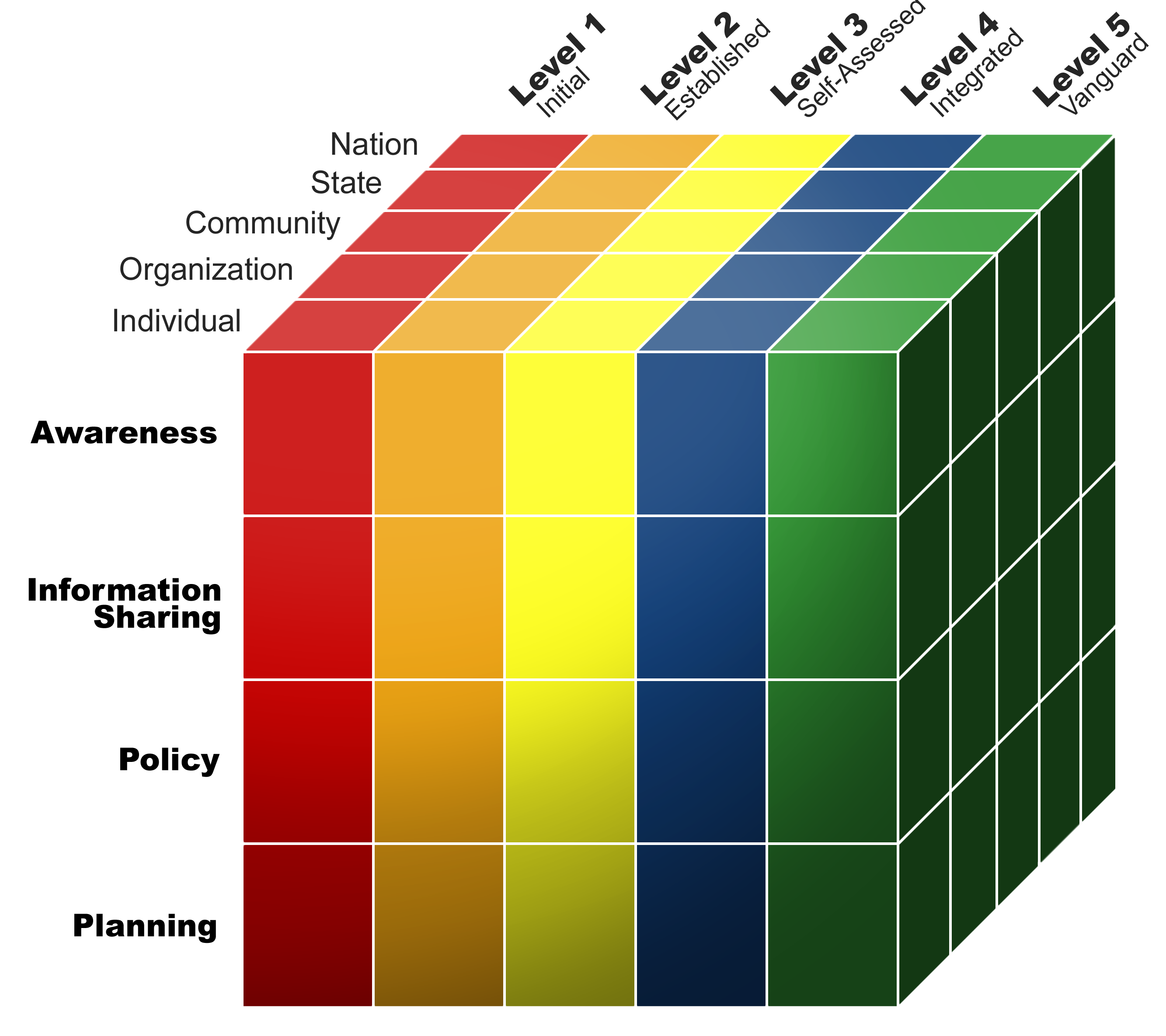 While participants learned about various cybersecurity issues, a common problem was a lack of understanding concerning where to start implementing a community-wide cybersecurity program. The CIAS studied this issue and determined what was needed was more specific guidance to help states and communities understand where to start and how to progress. This research resulted in the development of the Community Cyber Security Maturity Model (CCSMM), which provided both a way to measure the current maturity of the state’s or community’s program and guidance to know what steps they could take to improve.