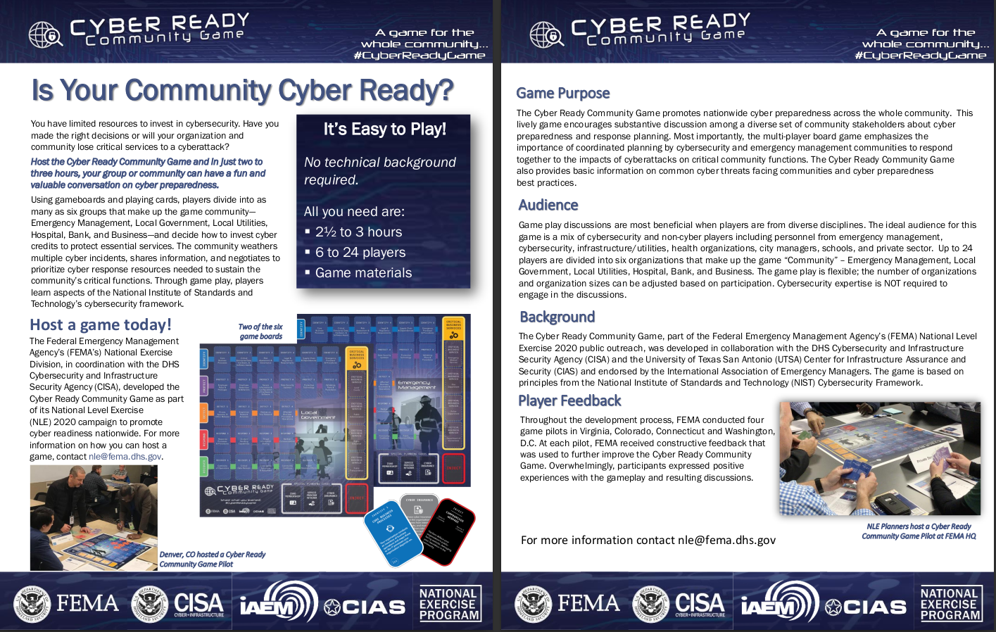 Download the two-page flyer for insights into the Cyber Ready Community Game and how your community can learn the dynamics of cyber preparedness and various aspects of the NIST framework. To request your personal copy of the Cyber Ready Community Game, email FEMAPubs@gpo.gov.